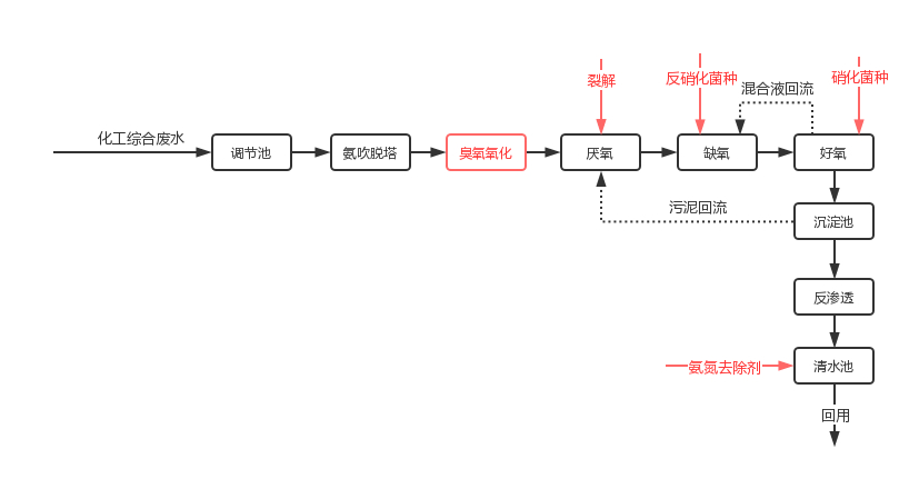 解决污水总氮去除方法有很多,合理地调整现场的污水处理工艺,对提高总氮去除效率犹为重要。我们可以通过一个比较典型的化工废水处理案例,来了解一下总氮的具体处理流程:
