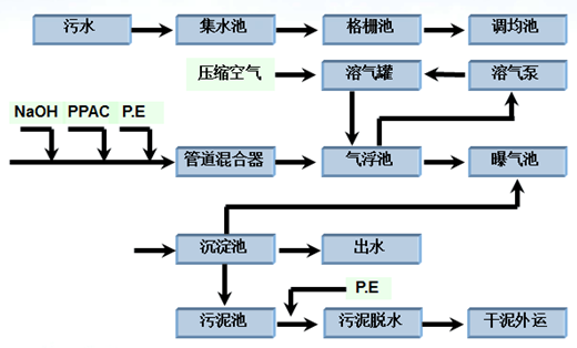 该印染厂拥有一个自己的小型污水处理站。现场工艺是:前端的物理格栅,然后经过气浮处理,后经